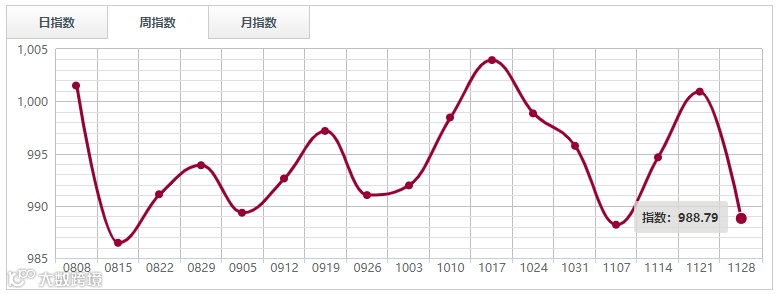 本周人造板市场呈现放量下跌行情,周指数报收988.79点,环比下跌1.21%。全周销量换增加3.3%,交易额增加2.17%。