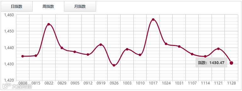 本周红木市场走出横盘整理行情,周指数报收1430.47点,周环比跌0.6%,全周销量环比微增0.77%,交易额增加0.05%。