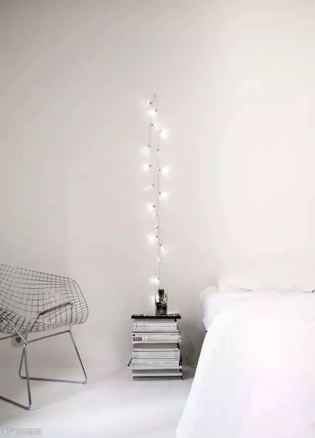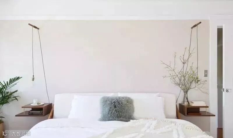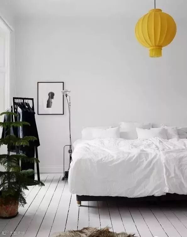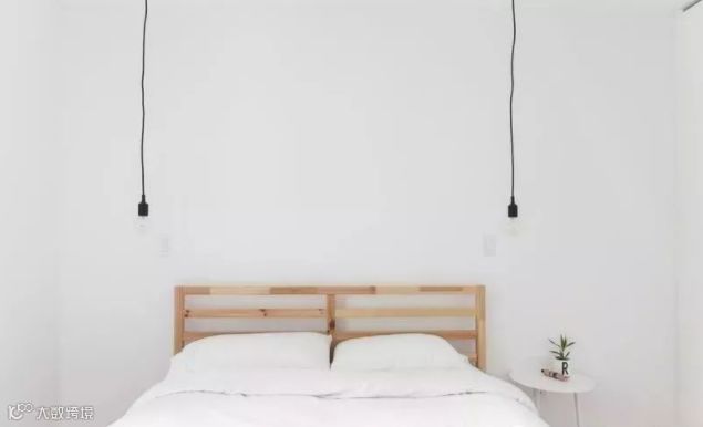 从天花板上悬挂一对黑色的线灯,让一间全白色的卧室不受色彩方案的干扰。