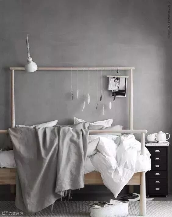 宜家这间灰色弄皱的房间利用线性床架悬挂装饰和可调工作灯。
