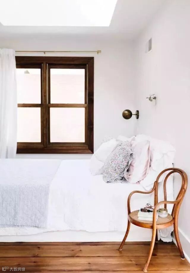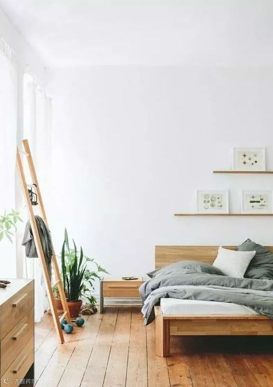 简易斜梯在柔和的空间中提供充足的储物空间,简单的原木搭白墙也使得整个空间舒适温馨了不少。