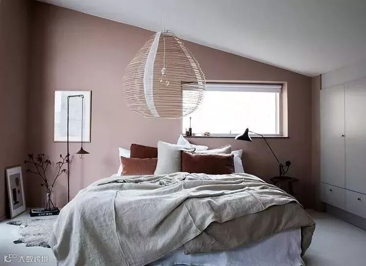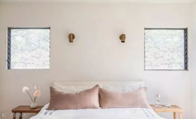 中性卧室因为腮红色枕头而变得有趣味性,简单的光头凳也让人产生舒适的感觉。