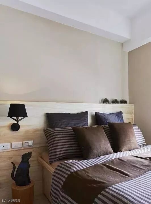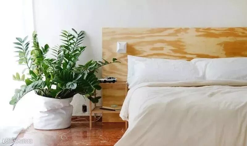 用一块未完成的木头作为床头板,边上的绿植也使得房间生机勃勃。