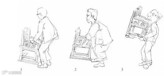 3 搬椅子不能搬扶手,两手应放在椅面下,因扶手的榫卯较为脆弱,以免损坏。也不能搬其后腿(上截),因后腿枝干较细,要经得起整只椅子的重量,这样容易损坏。