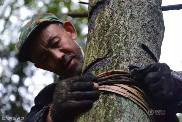 割生漆这行,因为不知道下一季是谁来割,所以按照行规,漆匠都会在树上留下足够的空间,让后来者“有口饭吃”。“看到破坏漆树的蚜虫、虫蛋,也要要将其消灭,绝后患。”图为余忠鼎在树上割漆。