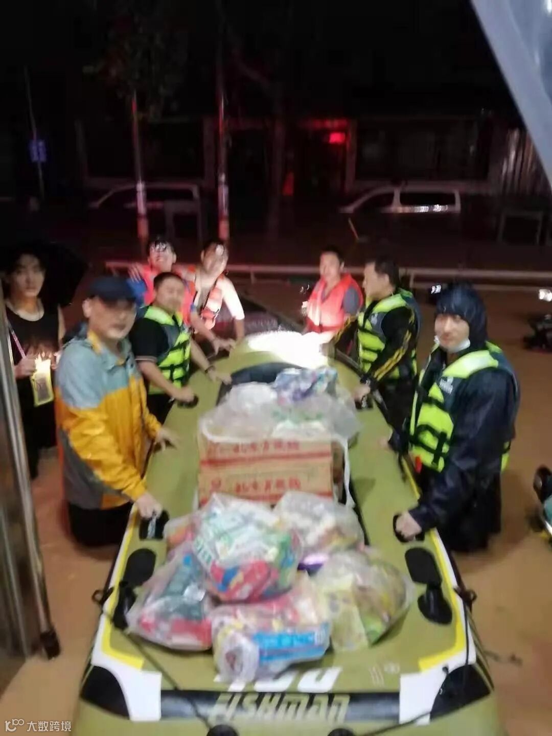 21日凌晨3:10,冲锋舟上,一堆堆物资转运着、配发着,一切井然有序。