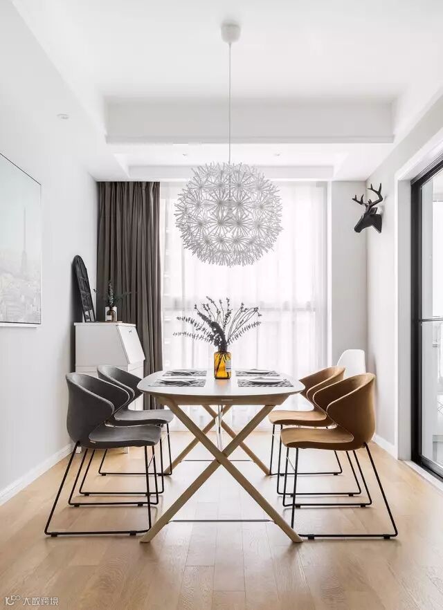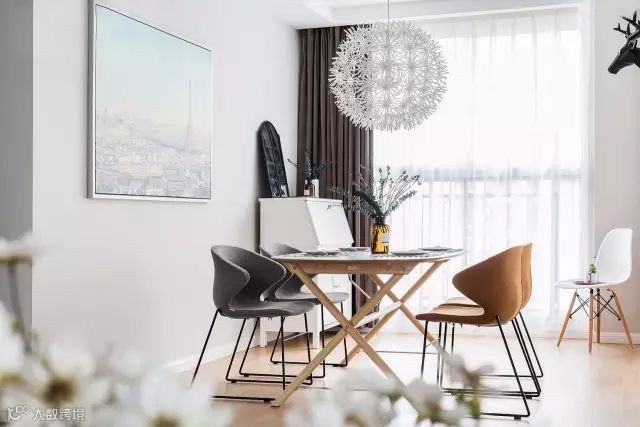 木质餐桌搭配双色桌椅,独具北欧风格的味道,简约的线条勾勒美好的形态,一盏球形吊灯为这个用餐环境增色不少。