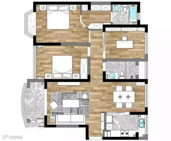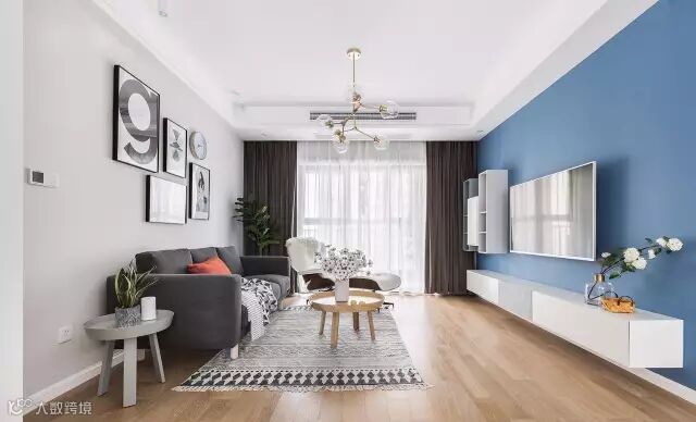 地面选择通铺木地板,打造视觉上的空间感,墙面采用蓝灰两种颜色,使视觉上具有层次感!