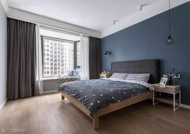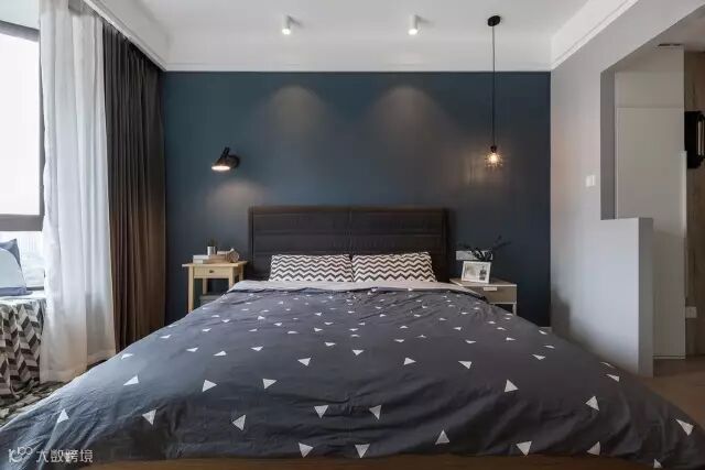 蓝灰调的空间硬装,搭配简约舒适的床品,设计感十足的灯饰,让整个空间都充满了年轻的情调。