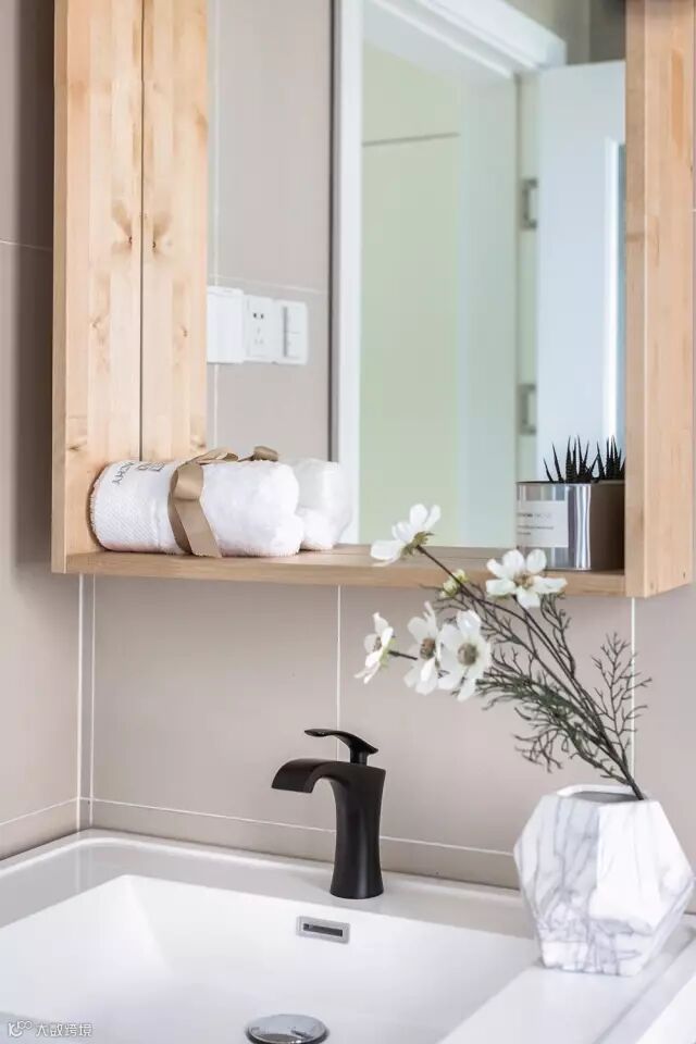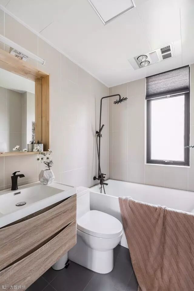 主卧卫生间,陶瓷的浴缸以及台盆,搭配木质的台盆柜,以及黑色的卫浴五金,构成了空间的简约与清爽。
