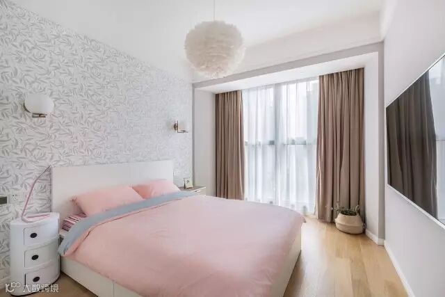 白色的床,搭配淡粉色的床品,营造了卧室的优雅氛围。