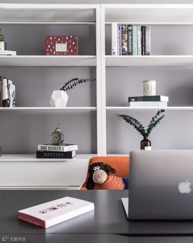 黑色的书桌,白色的铁艺书架,有序的排列让这间书房,显得井井有条,且突显出一种小精致。