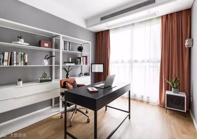 橙色的椅子和窗帘,又给整个书房空间,带来鲜明的视觉冲击。