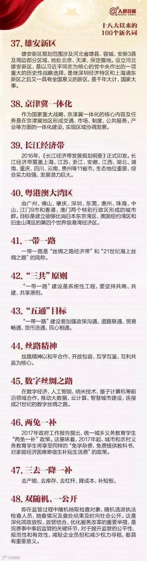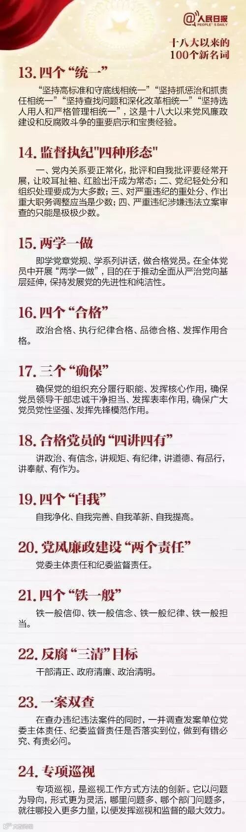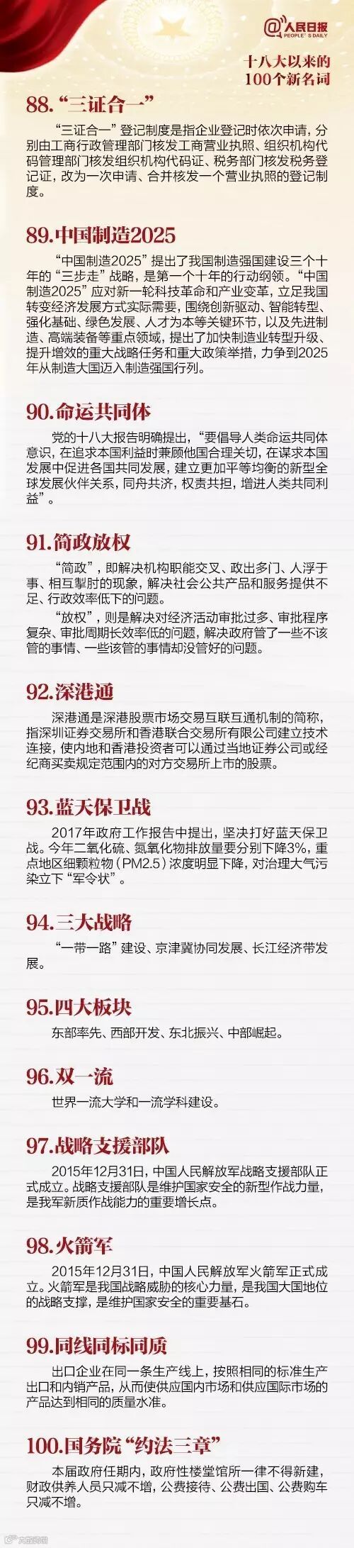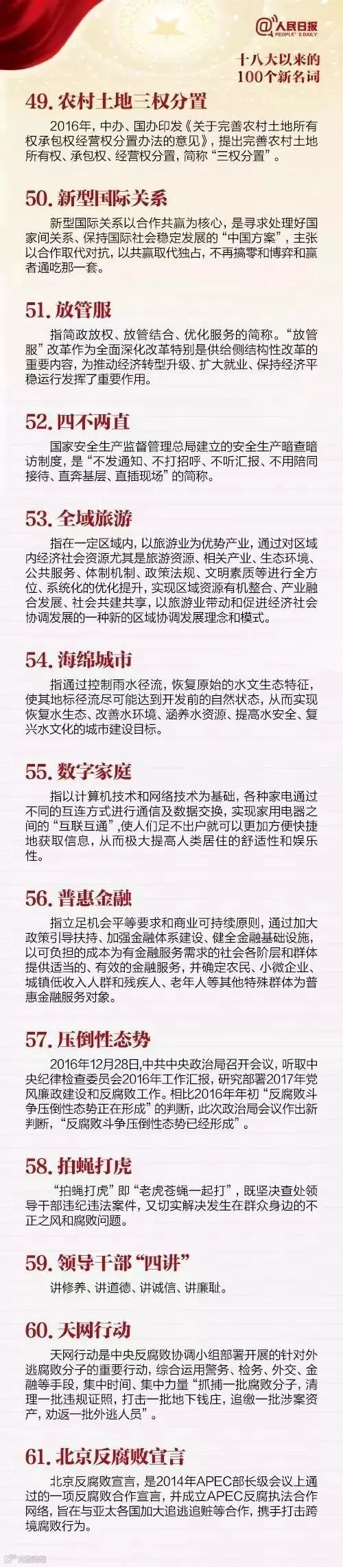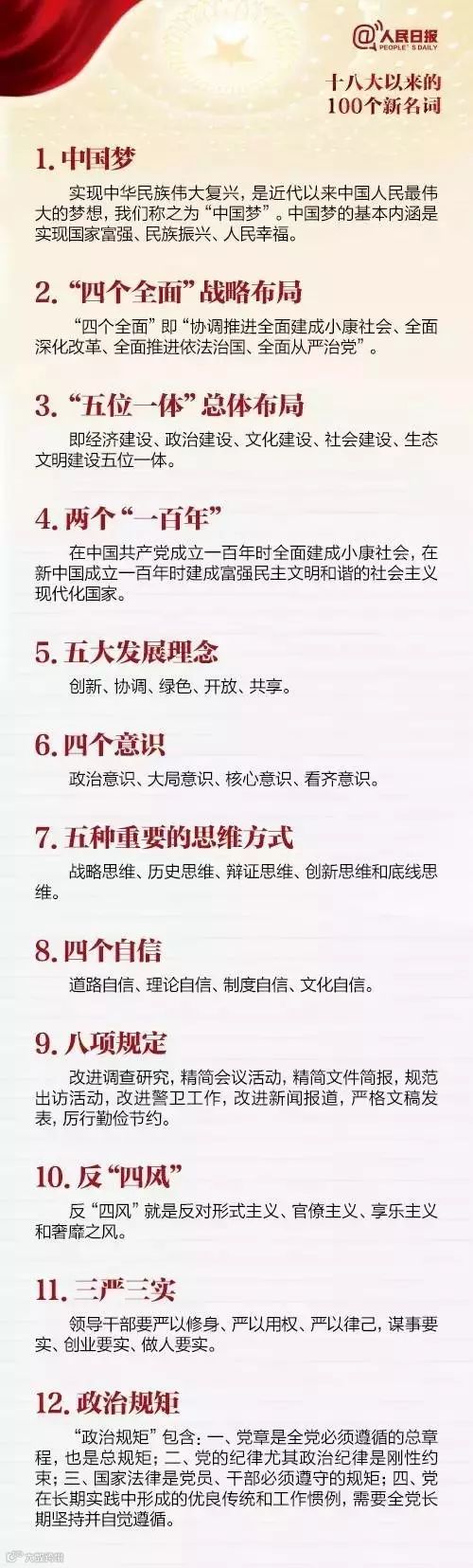随着十九大的日益临近,各级党组织都在积极开展迎接十九大的各项准备工作,小编特意为您梳理了党的十八大以来党中央治国理政的100个新名词,这将对我们更好地理解党的理论、路线、方针、政策具有重要意义。