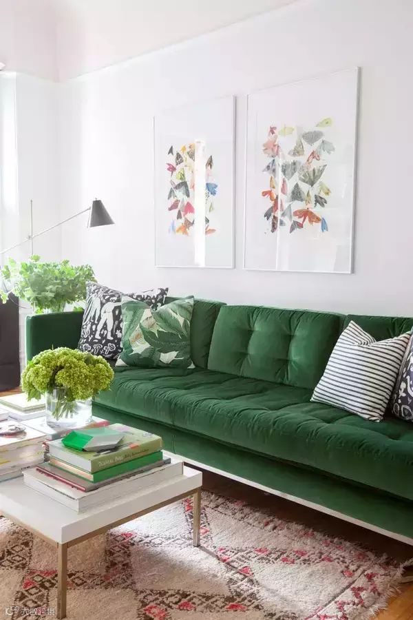 ▲沙发和靠垫都是绿色的,地毯再选绿色就糟糕了,地毯中加入些许红色小撞色一下