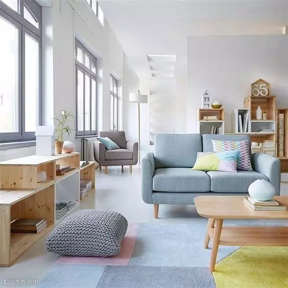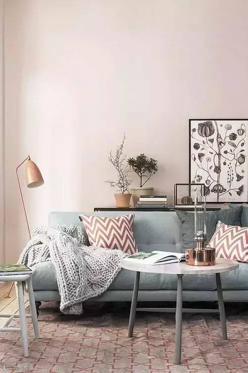 2.如果靠垫和沙发撞色,地毯要紧随沙发的颜色来保持主流。地毯的颜色最好比沙发浅一些,这样凸显层次感又可以避免头重脚轻。