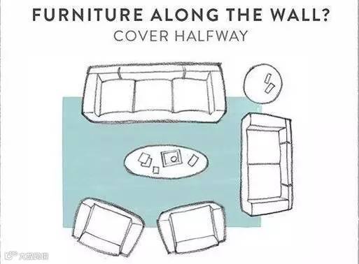 ▲沙发贴墙放的客厅最常见,那么就让所有四条腿家具的前两条腿都放在地毯上