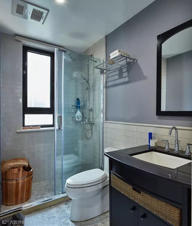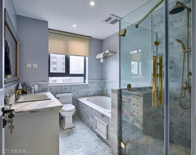 蓝白调搭配的卫生间,以水蓝的玻璃隔断,搭配出现代美式质感的氛围,整个空间都显得优雅高档又大方;