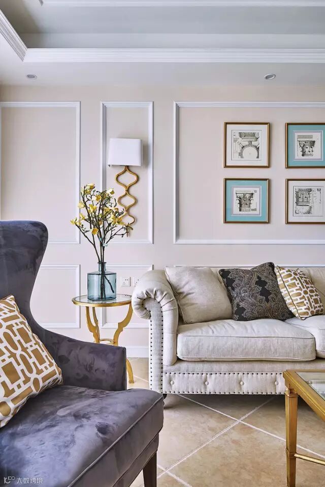 客厅以斜铺仿古砖的地面,搭配优雅的现代美式边框造型的墙面,接上墙面的精致挂画、奢华优雅的家具搭配,整个客厅都给人以独特高档的奢华气息;