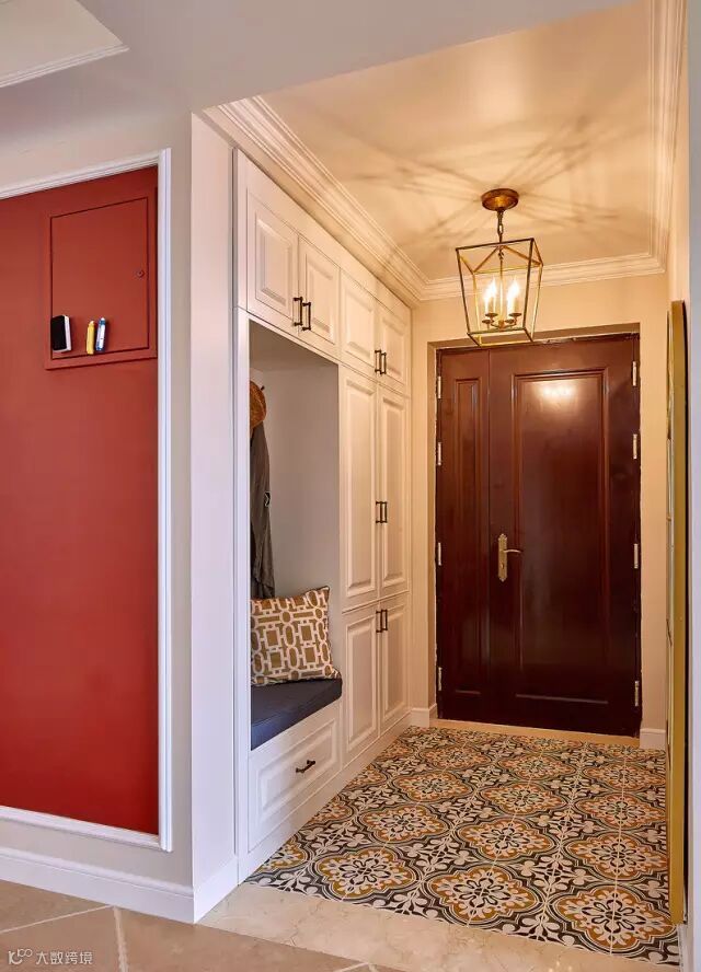玄关以花砖作为铺贴地面材料,结合入墙式的鞋柜并留出一个内嵌的换鞋凳,搭配金属框架的蜡烛灯,让人一进门就感受到了情调又实用的艺术气息氛围;