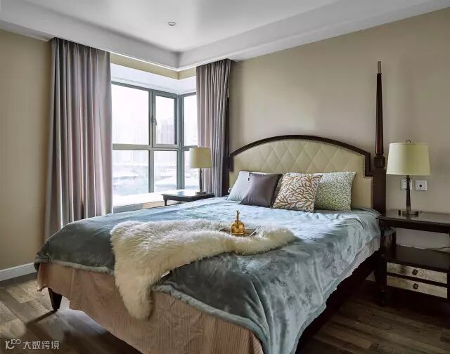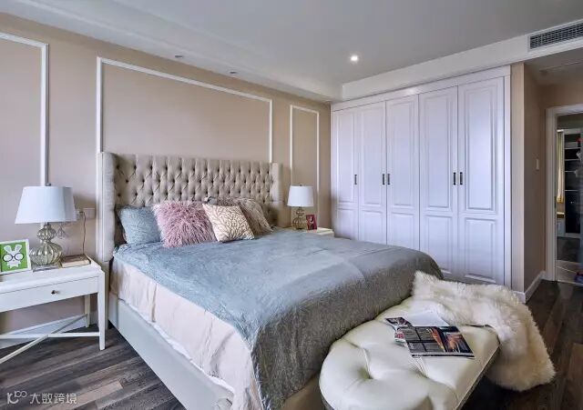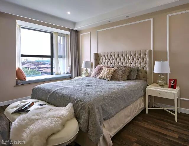 卧室背景墙也是奶咖乳胶漆+边框造型,搭配布艺软垫的床头靠垫,在飘窗的情调衬托下下,显得浪漫舒适又优雅温馨;