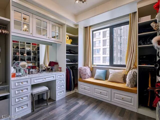 化妆首饰间与衣帽间组合一起,靠窗还做了个飘窗,显得浪漫优雅,很有气质的感觉;