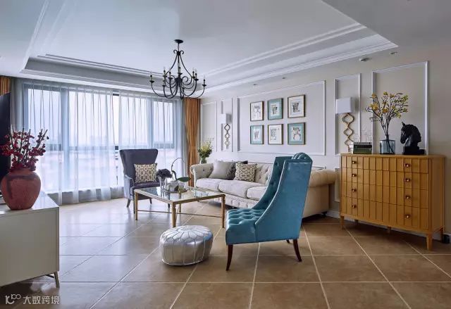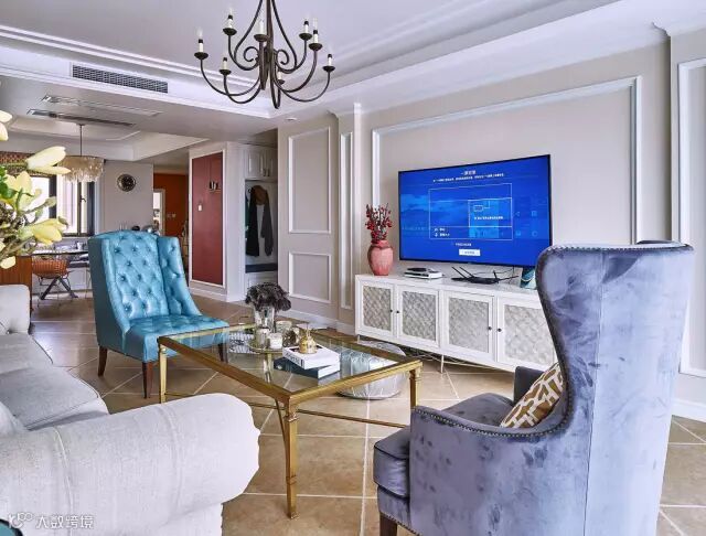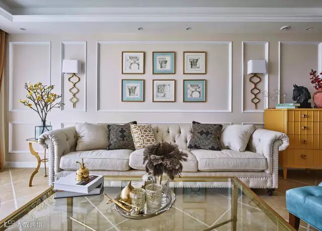 现代优雅的美式布艺沙发,搭配金属框架的玻璃茶几,显得奢华高档又年轻大方;