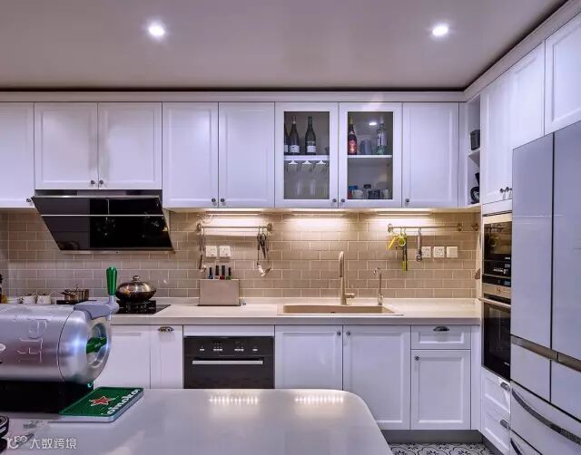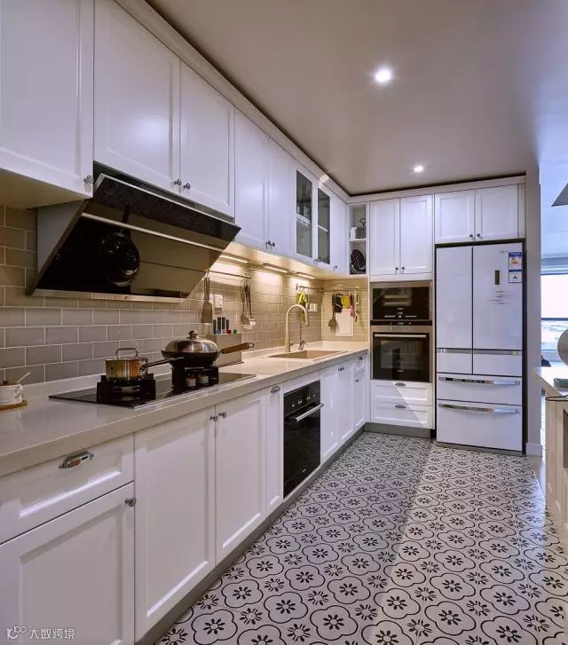 开放式的厨房地面铺的是花砖,而墙面则是仿古调的复古砖,搭配白色的橱柜面板,整个空间都显得格外的优雅小资大方;
