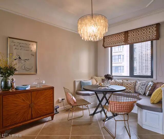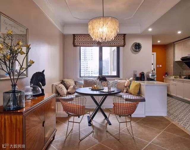 餐厅的的小圆桌,在靠窗位置结合厨房半隔断做了个户型的卡座,除了吃饭,这个靠窗的空间还是个非常情调舒适的休闲空间;