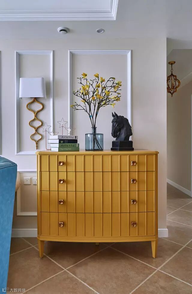 沙发墙靠近过道这里还摆了个艳黄的斗柜,摆上禅意的摆饰,整个空间都显得格外的时尚开朗的感觉;