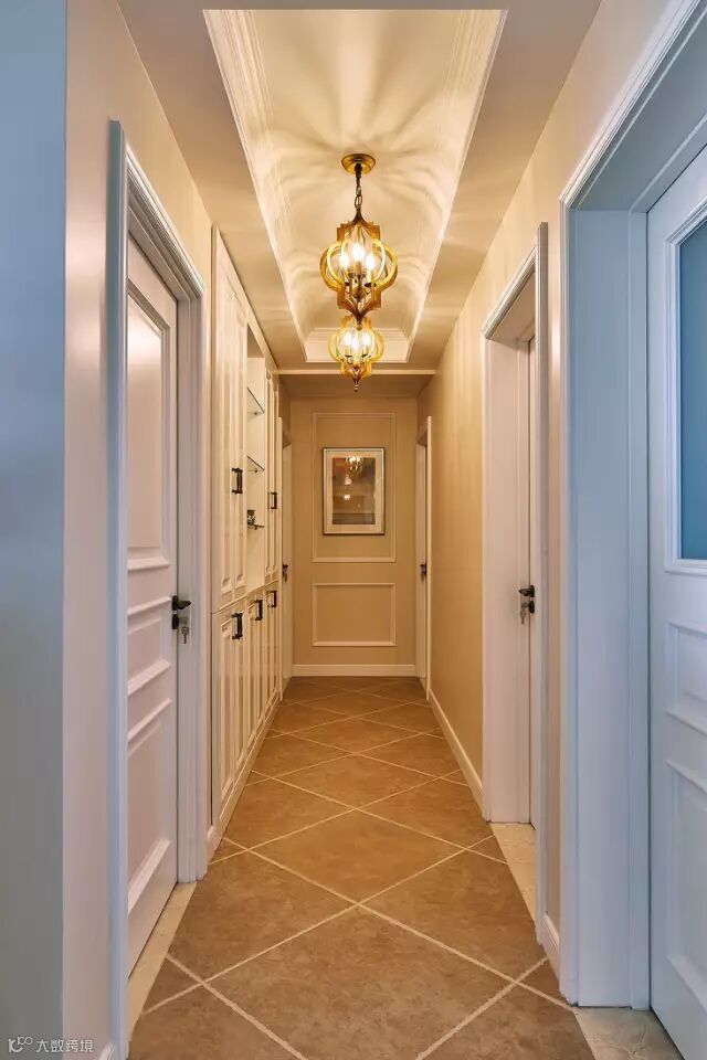走廊采用与客厅一直的斜铺复古砖,在走廊尽头做个简单的框架造型,搭配复古优雅的吊灯,整个空间都显得浪漫又温馨情趣;