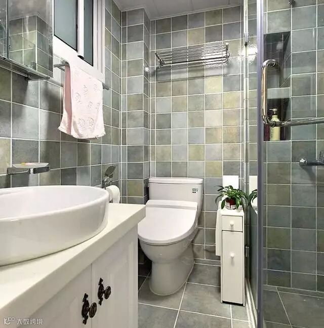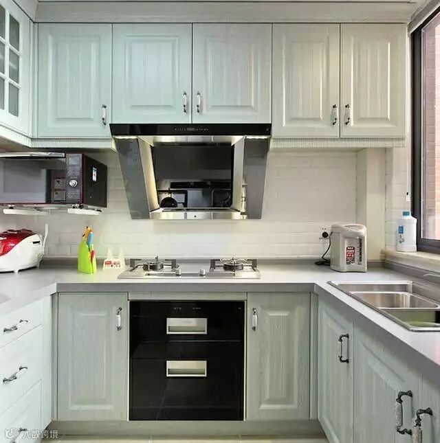 厨房的橱柜选择了嫩绿色,和墙面小白砖搭配起来,更显小清新风格。