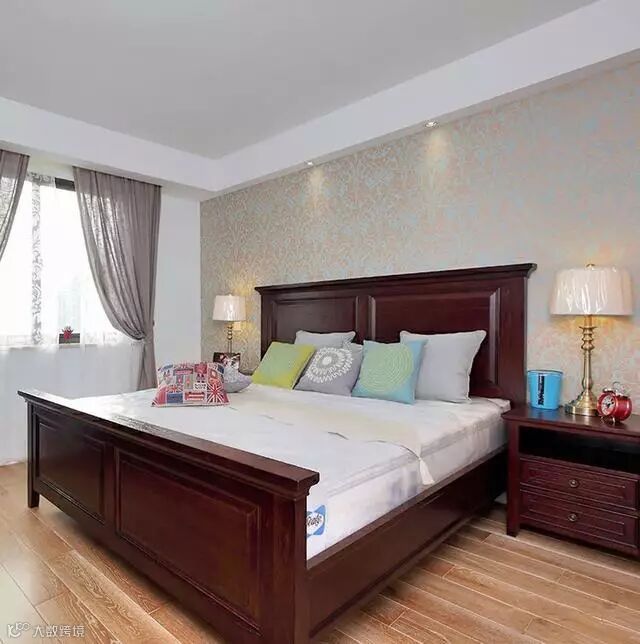 主卧的非常简单,壁纸背景墙、实木床和床头柜,都是买的成品。