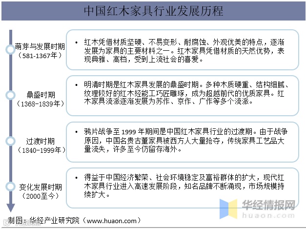 导读:中国红木家具行业的发展始于隋唐时期,行业经历约1500年的发展,具有深厚的历史积淀和传统文化内涵,其发展历程