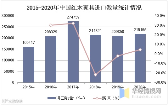 显示,2019年中国红木家具进口数量为209850件,2020年中国红木家具进口数量为219155件,2020年相对于2019年上升了4.4%。