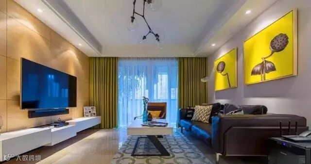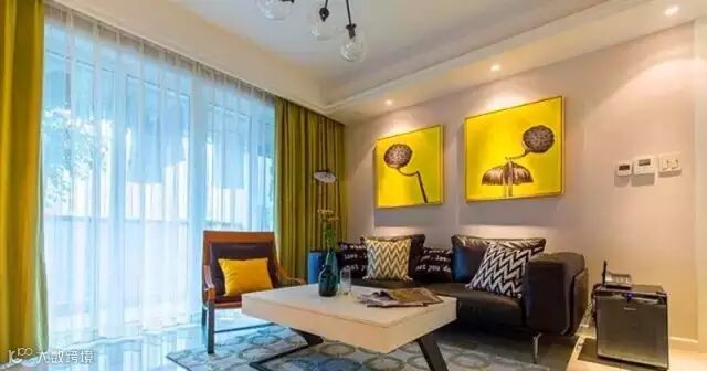 ▲整体布局里充满温暖的鹅黄色, 沙发背景墙上的一对黄色底纹莲蓬装饰画尤其抢眼,点亮了整个空间,如有灯光的感觉,与同色系的窗帘相呼应。