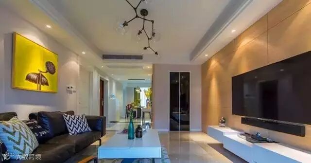 ▲ 电视背景以科定板饰面,简洁大气,金色的背景墙把客厅空间拉的很开阔。