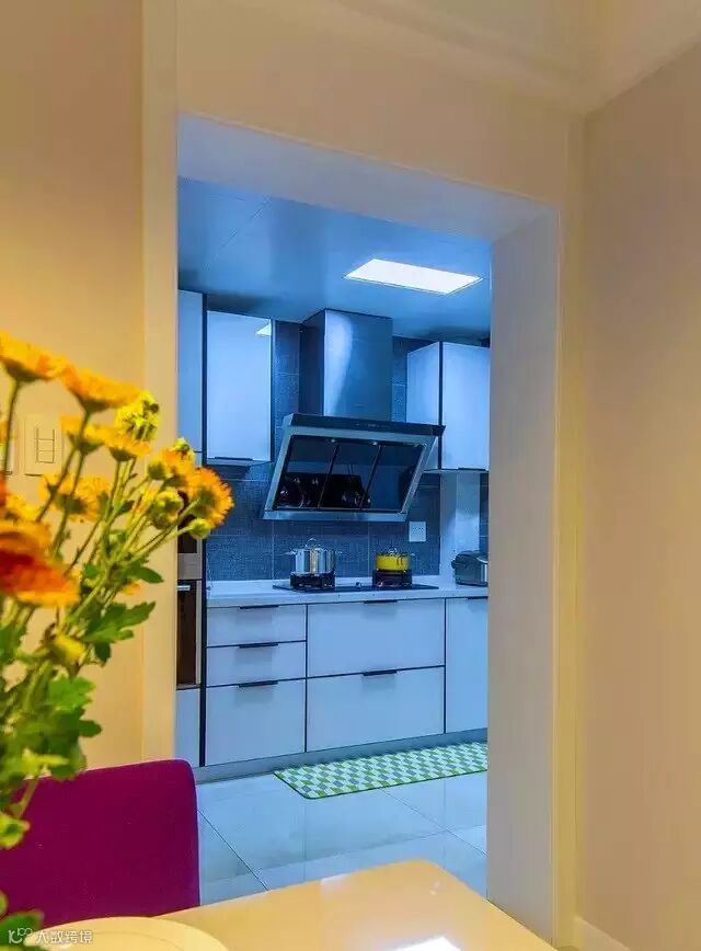 ▲厨房内外,灯光对比明显,视觉上冷暖交合,其实厨房里应用光线强的灯。