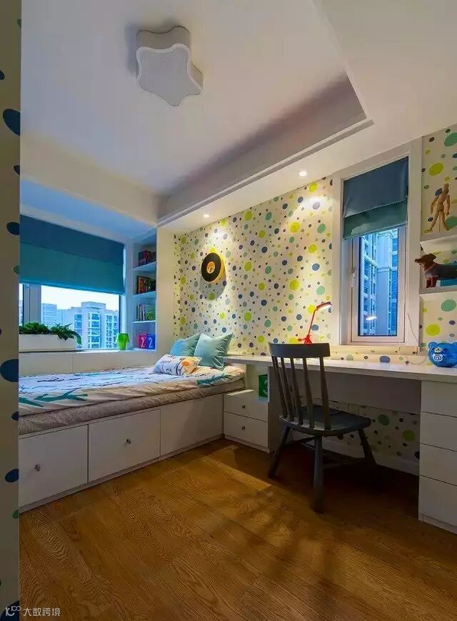 ▲ 视野很开阔,有两面窗口,定制地台床,增加了收纳空间,飘窗两侧也合理利用起来。