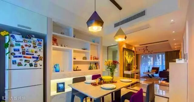 ▲ 餐厅背景设计了一面墙的收纳柜,同时把冰箱嵌入,成功利用死角空间。