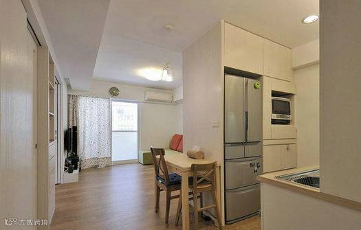 面积较小的厨房,除了善用墙面空间(吊柜+收纳架),也要考虑电器的摆放。