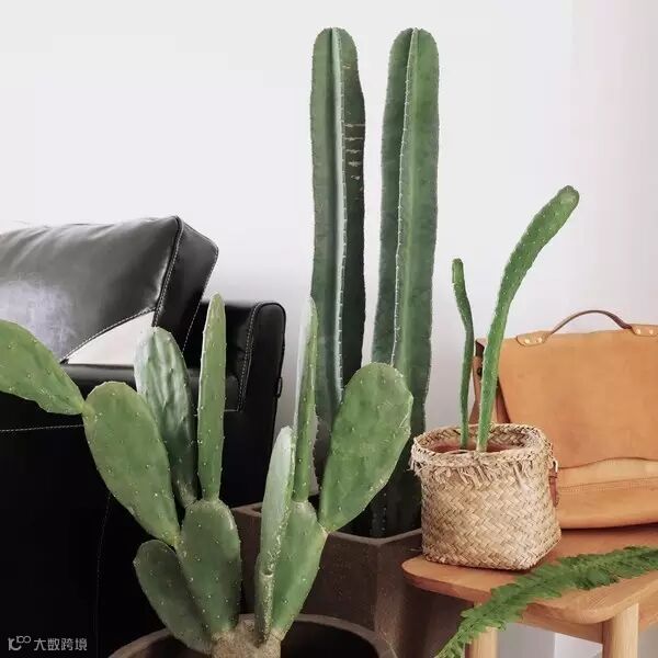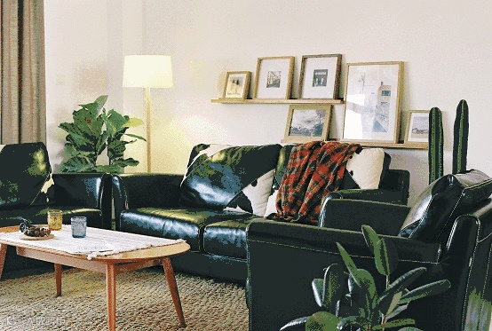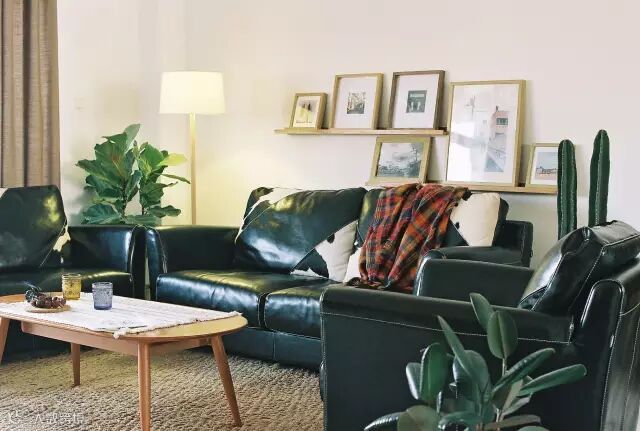 以原木色为基调的客厅,用很多大叶绿植装点
