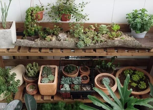爬山捡回来的木桩,里面铺水苔,种满多肉,成了最天然的花器。