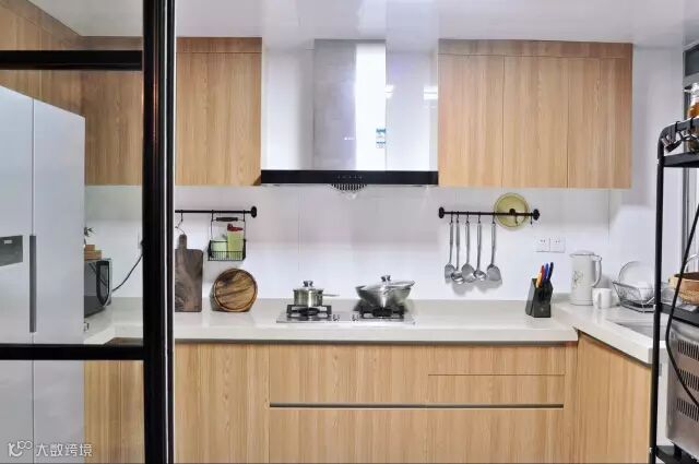 整体橱柜做足了功课。U型厨房,符合我们备餐和烹饪的动线。平时养成顺手整理的习惯,台面也比较整洁,洗衣机、清洁用品、渔具都藏在右侧的生活阳台。