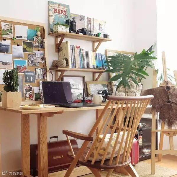 书房是我俩共用的,为了不互相打扰,基本不会同时使用,所以只摆了一把椅子。他画画时,我去餐桌,我用电脑时,他去客厅。画架是我们艺考的回忆,除了挂壁挂,基本就是摆设。桌下的singer古董缝纫机,是他大学时送我的礼物。