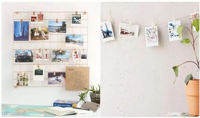 至于书桌前的墙面,简单地做成相片墙,用不伤墙面的胶,或者是用铁网、细线穿引起来即可。