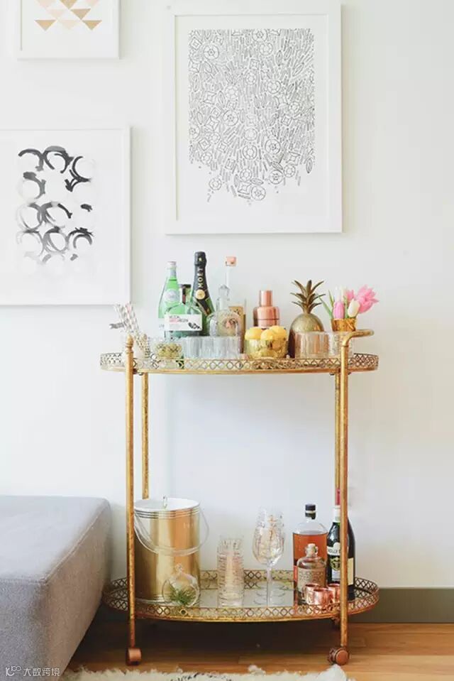 除非家里面空间实在太小,否则真的不妨买个Bar Cart,把酒水饮料、杯子什么的统统整理好放在这里,看起来整洁而且美观。这类的小餐车在宜家就能找到,如果想要看起来更漂亮,完全可以网购两罐五毒金漆将银色的金属部件喷成金色。