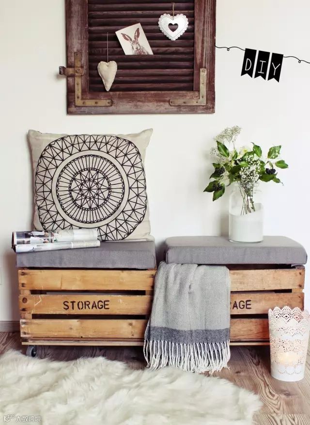 如果能够获得这样的木箱,请千万不要随便丢掉,因为只需要三四个就能DIY成一件家具。它既可以是入门口的鞋柜、换鞋椅,也可以做成置物架,还可以改造成茶几,甚至是书桌。不喜欢它的颜色?那么完全可以买木漆回来自行换色。