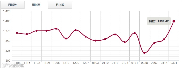 中国木材价格指数(CTI)综合指数本周报收1258.43点,环比上涨1.3%。其中广东鱼珠木材价格指数(YTI)报收1122.53点,上涨2.03%;上海福人木材价格指数(FTI)报收1459.81点,上涨1.98%;大西南木材价格指数(DTI)报收1048.11点,涨1.66%;山东临沂木材价格指数(LTI)收于838.10点,涨0.44%;江西南康木材价格指数(JTI)收于1630.96点,上涨0.04%。
