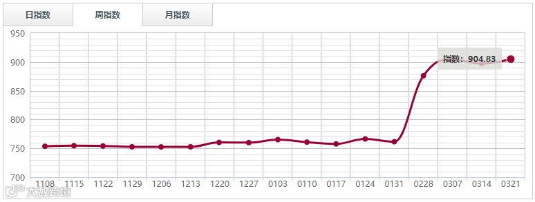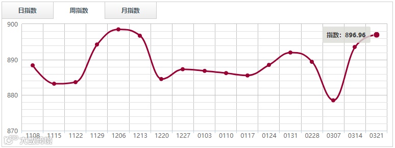 本周人造板指数继续拉出小阳线,报收896.96点,环比上涨0.38%。各大市场当中,鱼珠人造板指数、福人人造板指数分别下跌0.22%、0.02%;大西南人造板指数、临沂人造板指数分别上涨0.63%、0.44%。